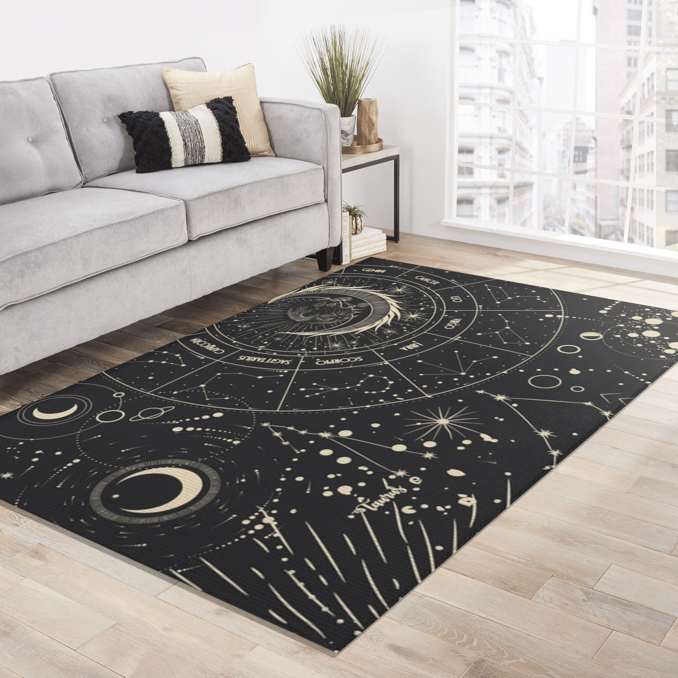 - Celestial Gold Black Moon Stars Sun Area Rug Spiritual Witchy Witch Goth Gothic Pagan Wiccan Wicca Astrology Zodiac Witchcraft great for any decor, adds texture to the floor and complements any decor.