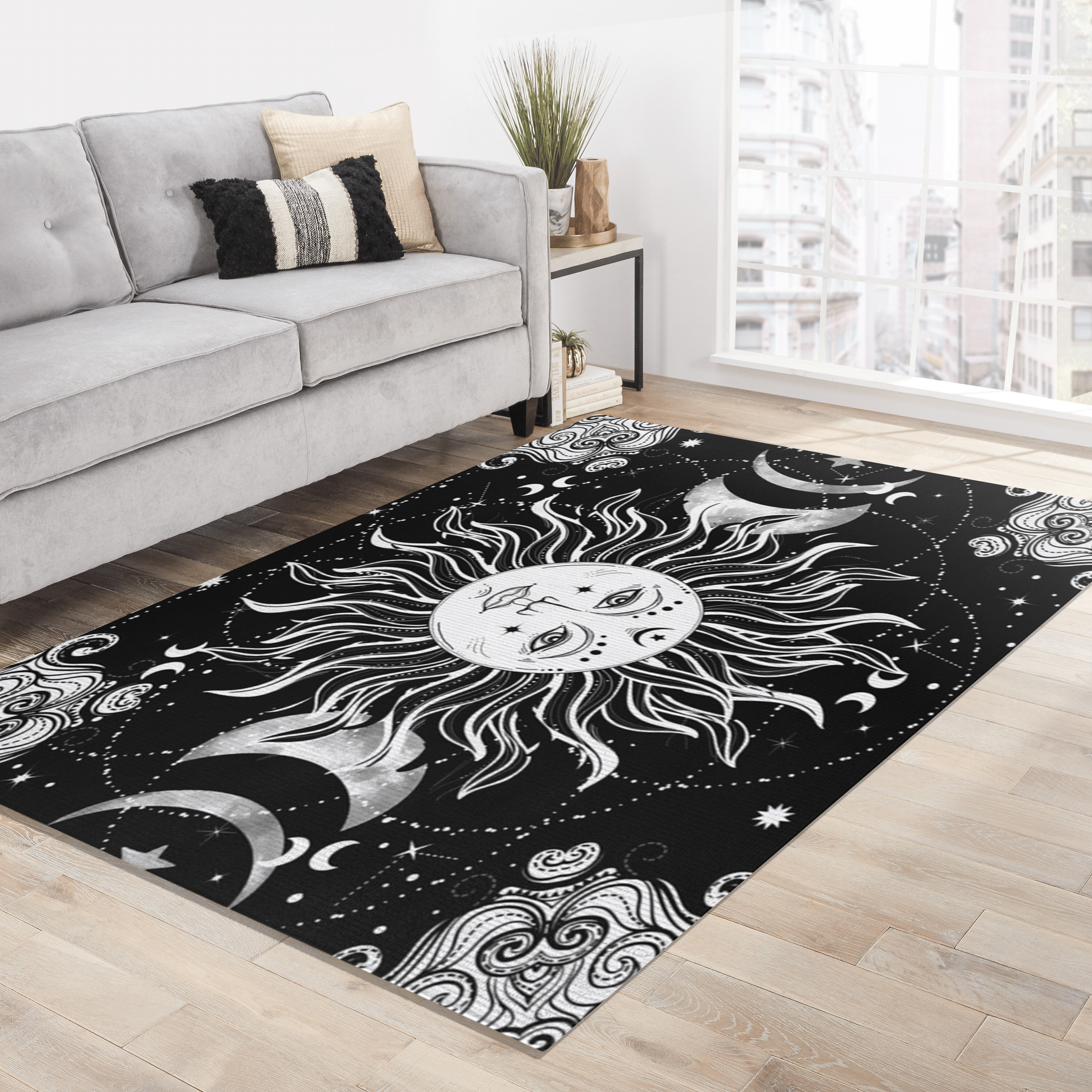 - Magic Sun Area Rug Black And White Celestial Bohemian Rug Luna Floor Mat Gothic Home Decor Galaxy Stars Carpet Starry Night Sun And Moon great for any decor, adds texture to the floor and complements any decor.