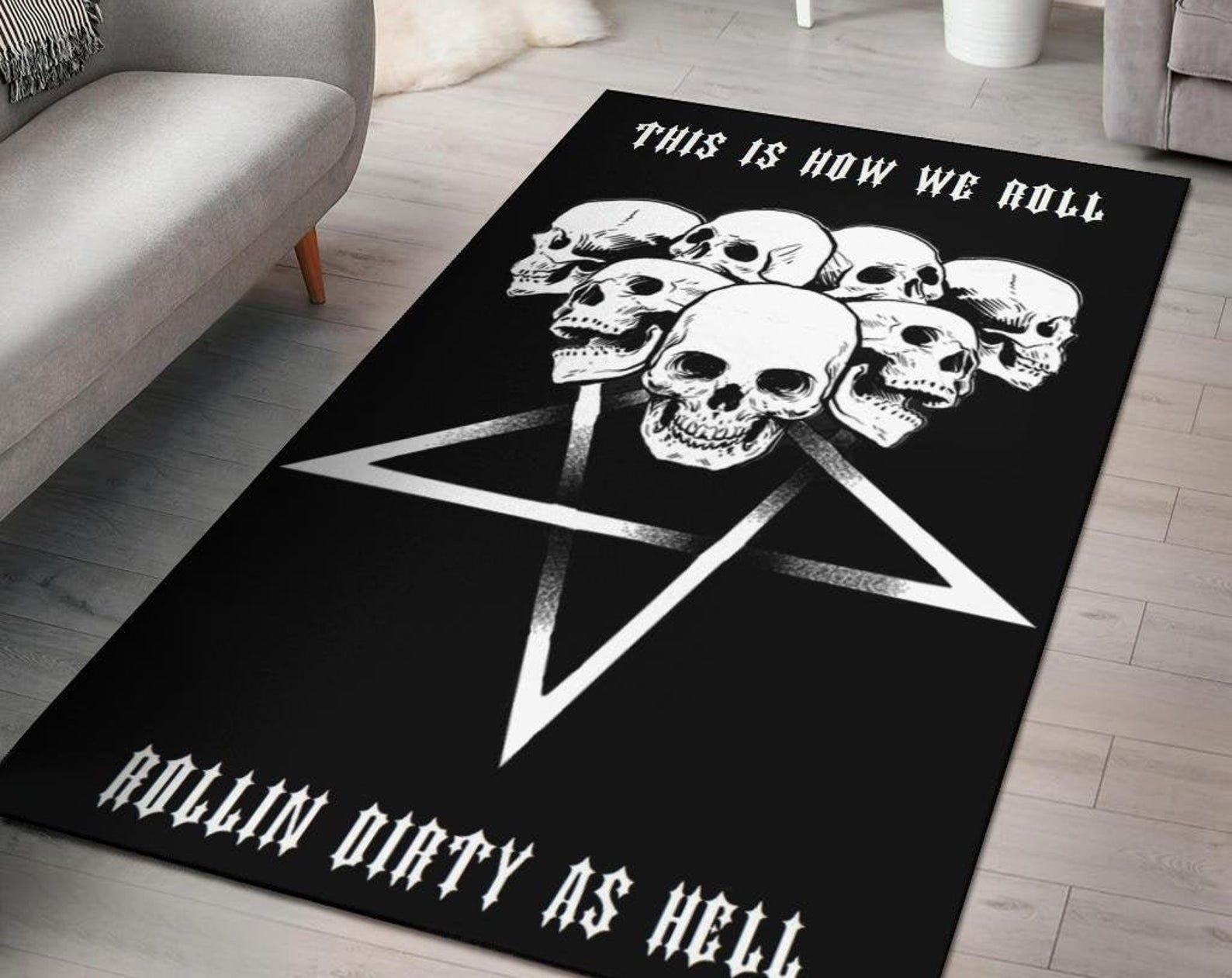 - Satanic Skull Inverted Pentagram Sharp Steel Blade This Is How We Roll Area Rug Gothic Home Decor great for any decor, adds texture to the floor and complements any decor.