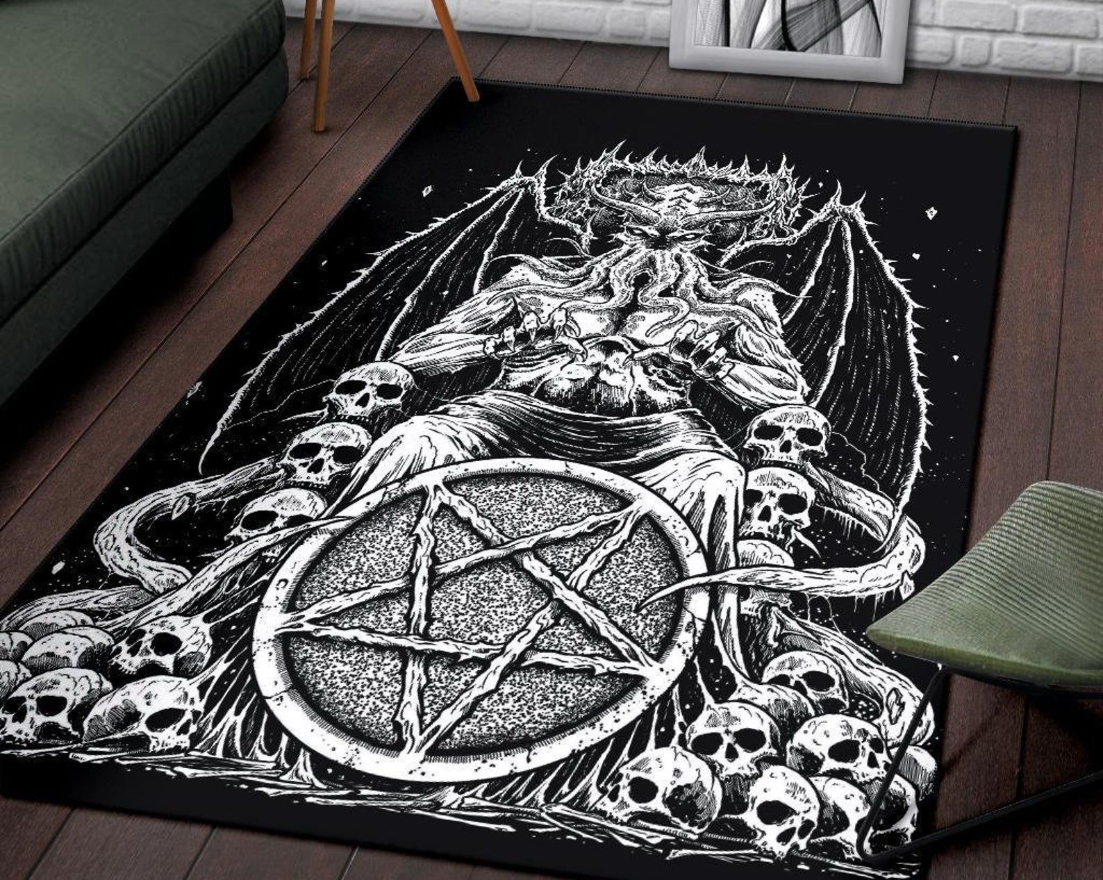 - Skull Satanic Pentagram Demon Bat Wing Octopus Skull Throne Area Rug Gothic Home Decor great for any decor, adds texture to the floor and complements any decor.