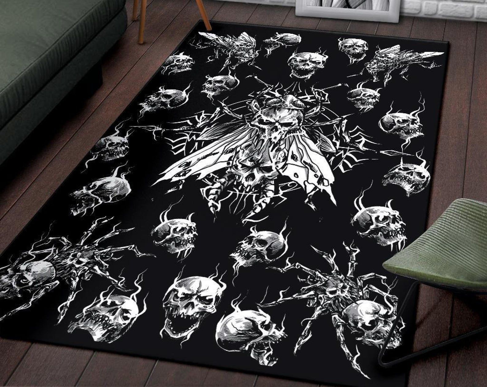 • Smoke Skull Evil Goth Spider Fly Area Rug Black And White Gothic Home Decor great for any decor, adds texture to the floor and complements any decor.